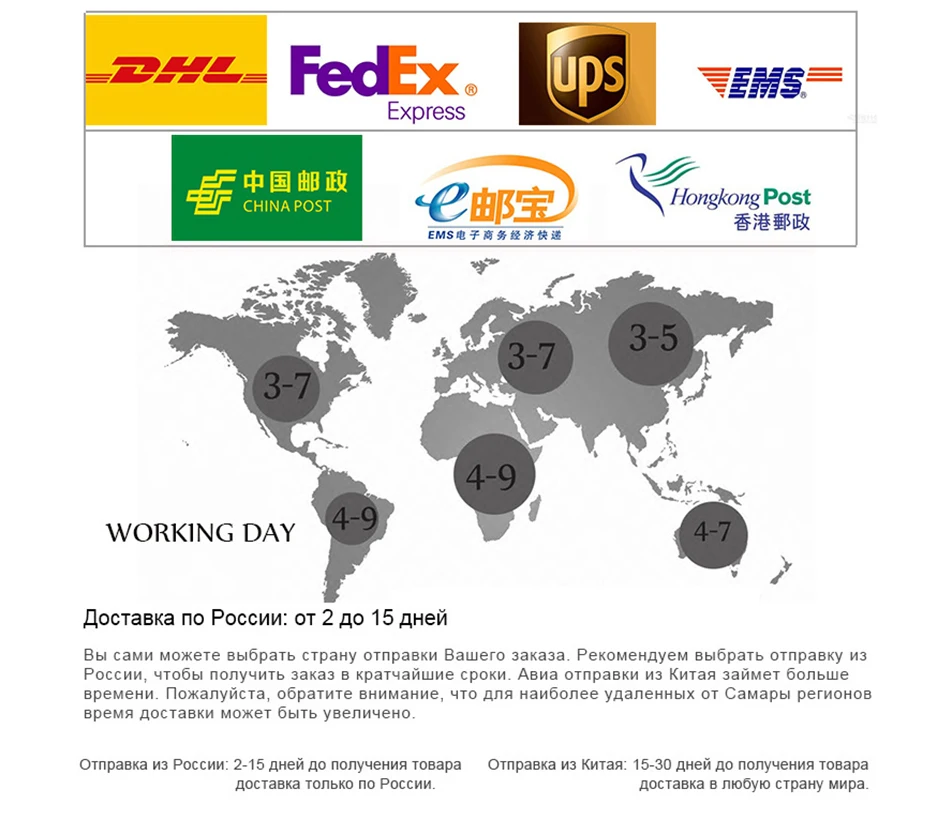 We ship worldwide by China post Air Mail,EMS,DHL,UPS,FEDEX,Hongpost and so on.Fast shipping about 3-7days,post mail shipping about 15-30 days in working day!