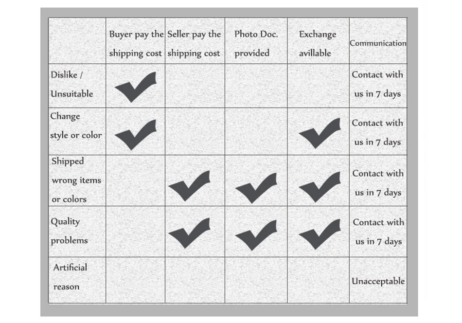 If you have any problems with the items received,please let us know within 7days after the item delivery.Please contact us before you open dispute and send items back.Please ensure the item will be returned in good condition with original package.We will send replacement or refund once the item is received.
