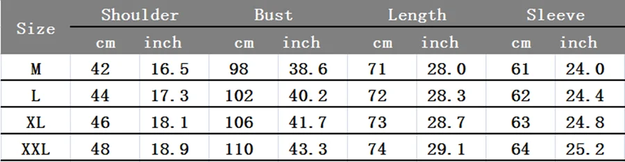 NOTE: Please measure the clothes you usually wear, not your body. Then choose size according to the table. All the size we have is Asian size, please choose 1-2 size larger than you usually wear. The size is measured by hand, 1-4cm errors should be accepted