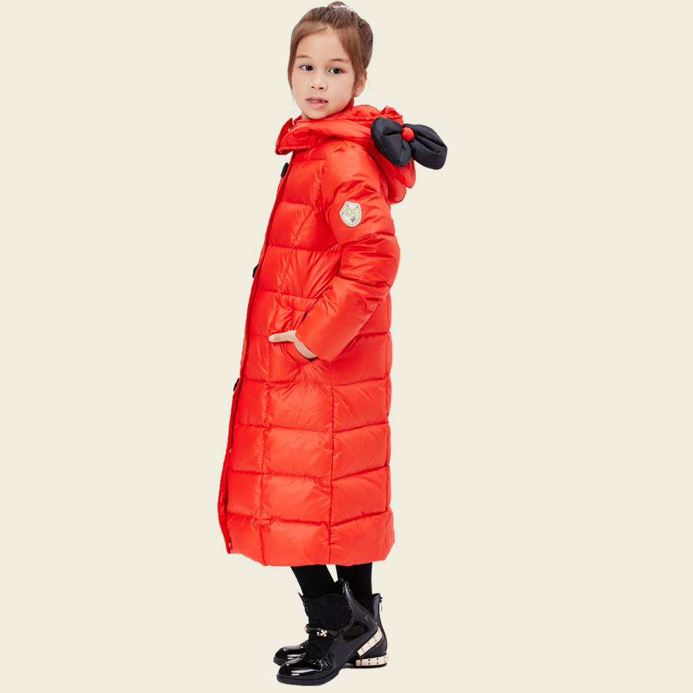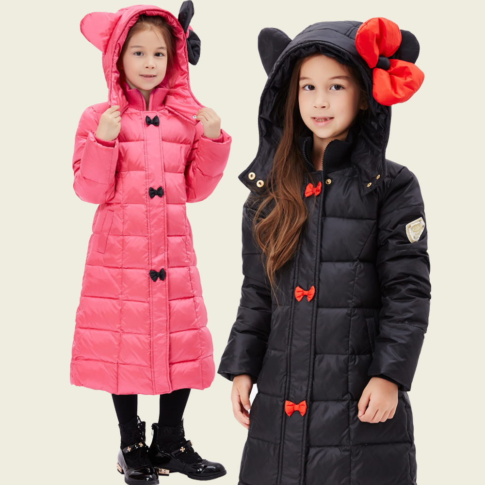 Feather: Great quality, excellent work of sewing Cartoon shape, bowknot decor,Eroupean fashion Style Long item, bring more warm for little girl White duck down filling,thick enough for Russian Specification: Outerwear Type: Down & Parkas; Clothing Length: Long; Material:Polyester; Filling: Duck down; Down Content:80%; Closure Type: Zipper; Collar: Hooded; Pattern Type: Bowknot; Sleeve Style:Regular; Style: Eroupean Style; Gender:Girls; Size:3T=110#; 4T=120# ; 6T=130# ; 8T=140# ; Note: Don't choose size according baby's age. pls comfirm child's height and weight Detail size is important, If you don't how to choose size, pls feel free contact us to get right size. Tell height and weight is available Jacket size detail:(UNIT:CM)