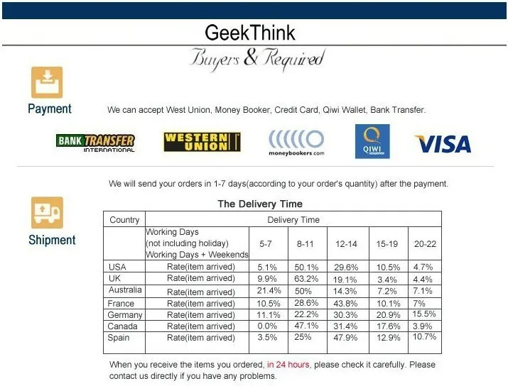 ** If you have not received your shipment within 30 days from payment, please contact us. We will track the shipment and get back to you as soon as possible with a reply. Our goal is customer satisfaction!