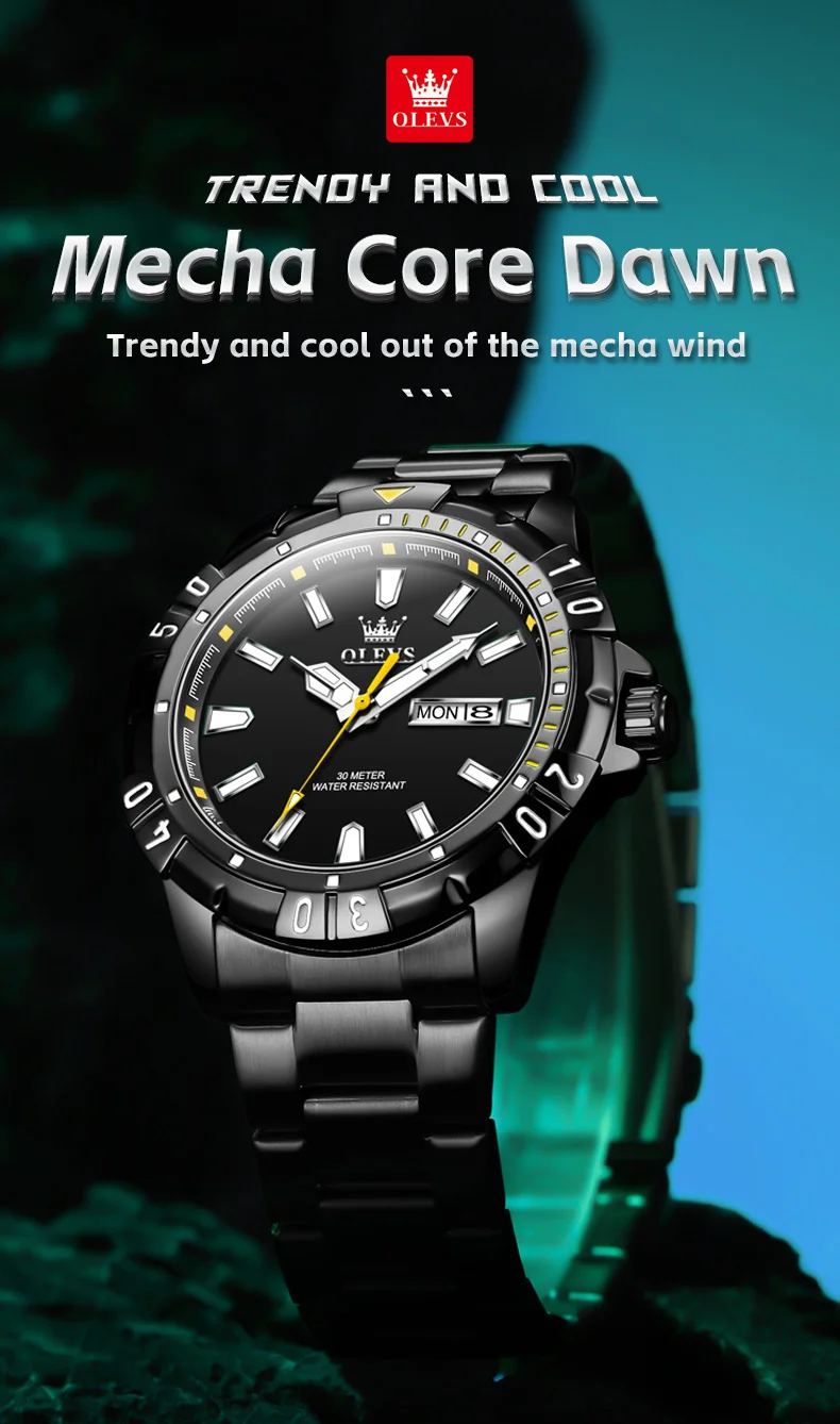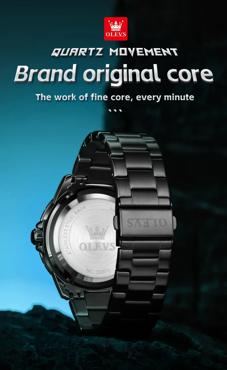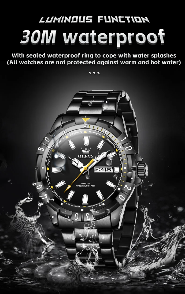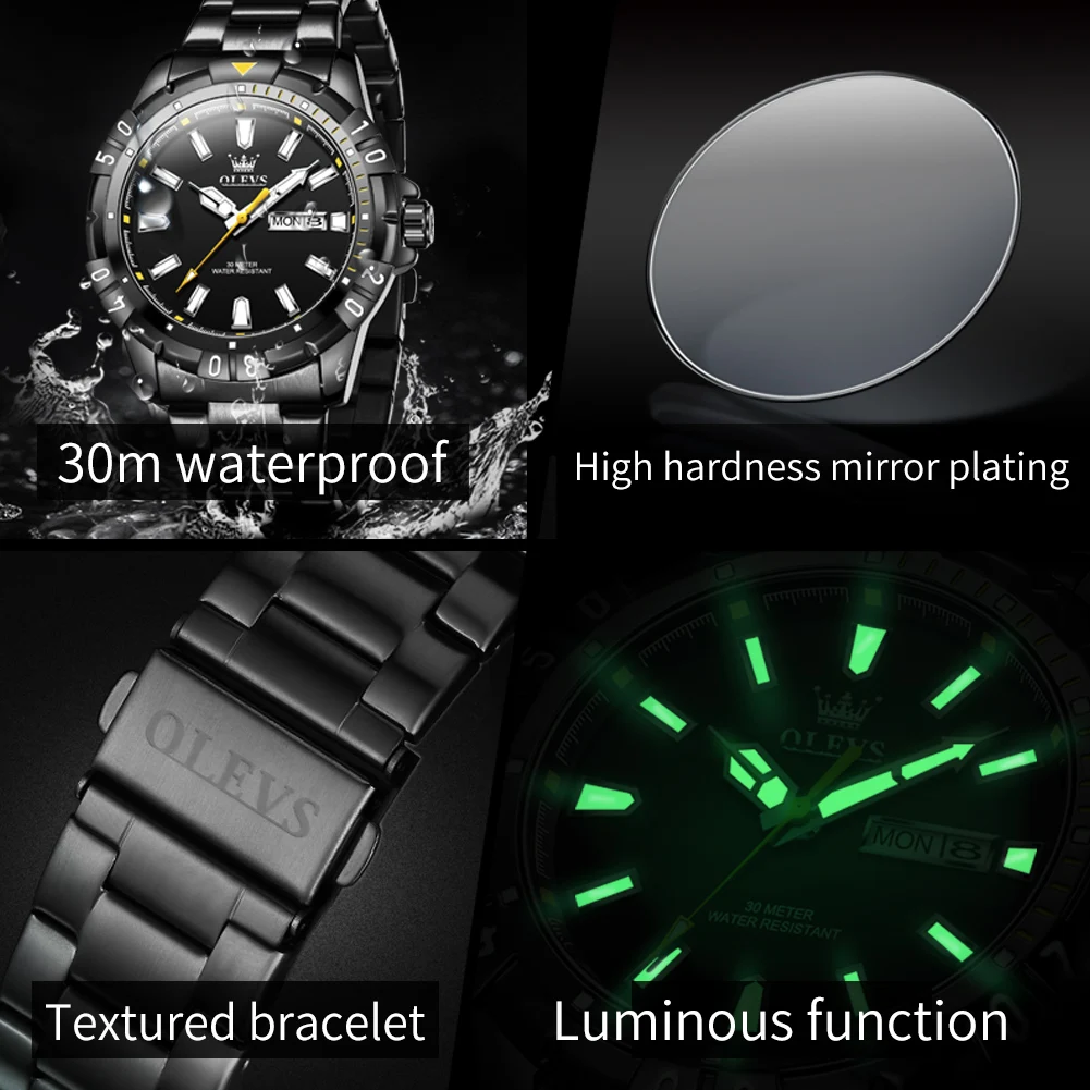 OLEVS Luxury Stainless Steel Black Sports Quartz Watch for Men Waterproof Luminous Week Date Mens Watches Relogio Masculino