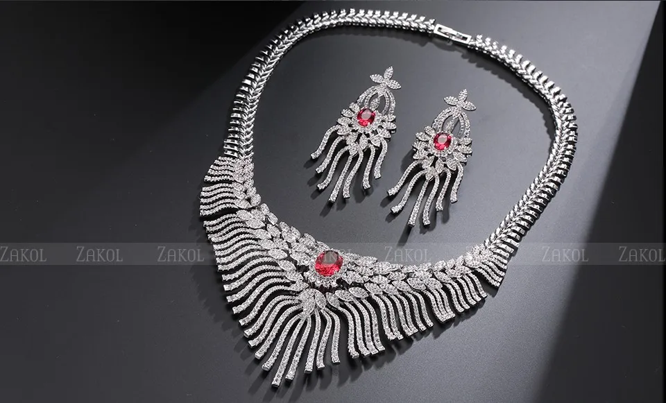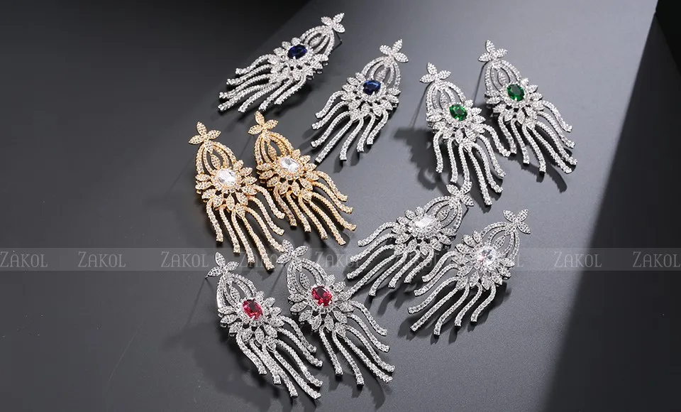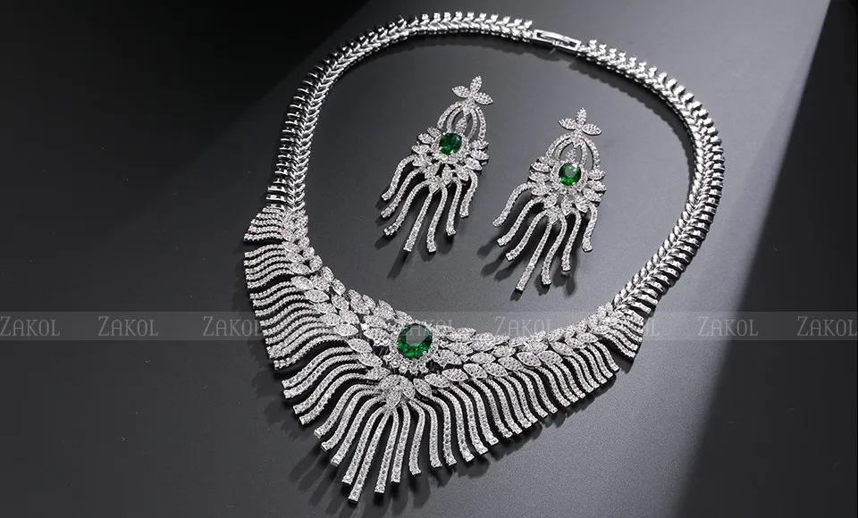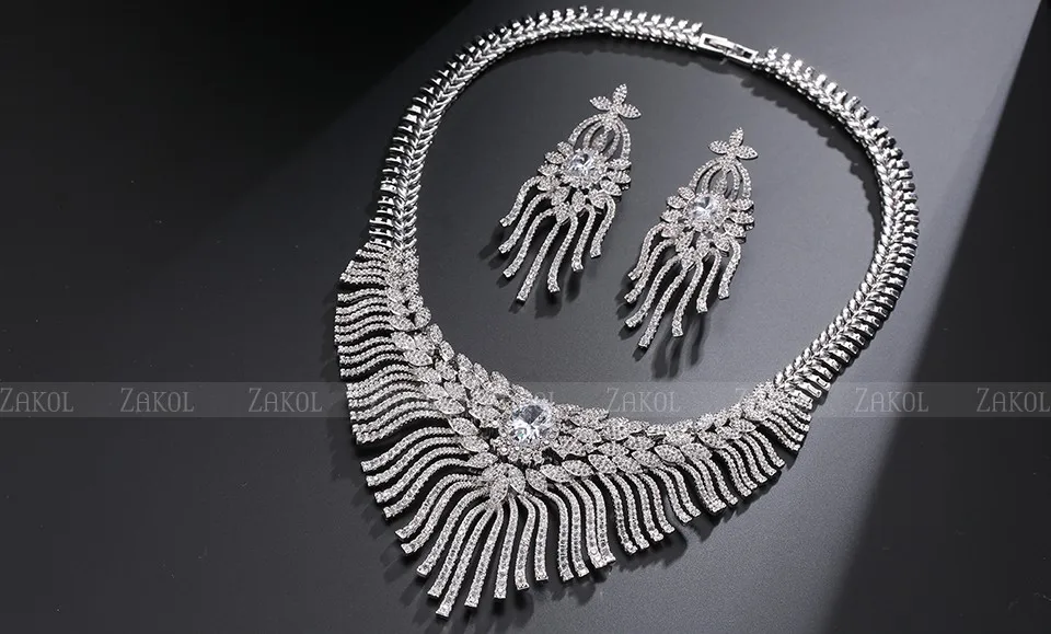 ZAKOL Luxury Oval Cubic Zircon Tassel Jewelry Set Brilliant Zirconia Micro Inlay Earrings Neckalce Set For Women Wedding FSSP298