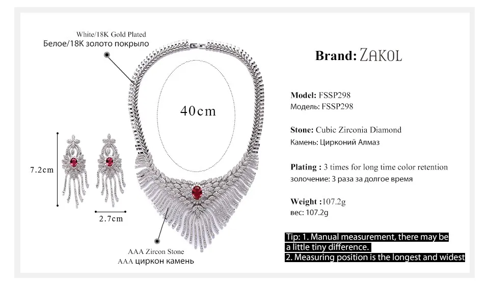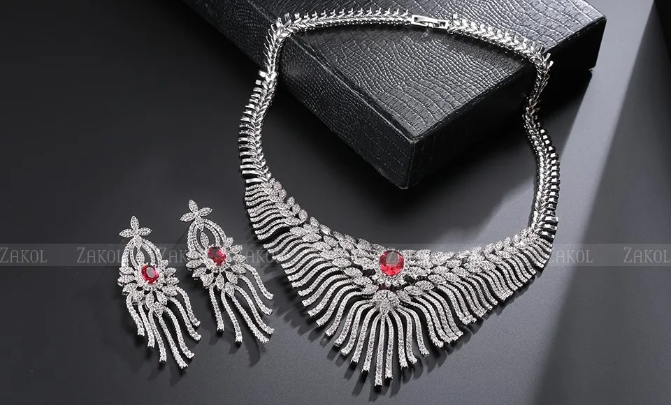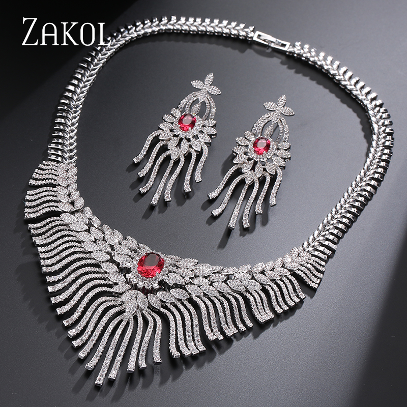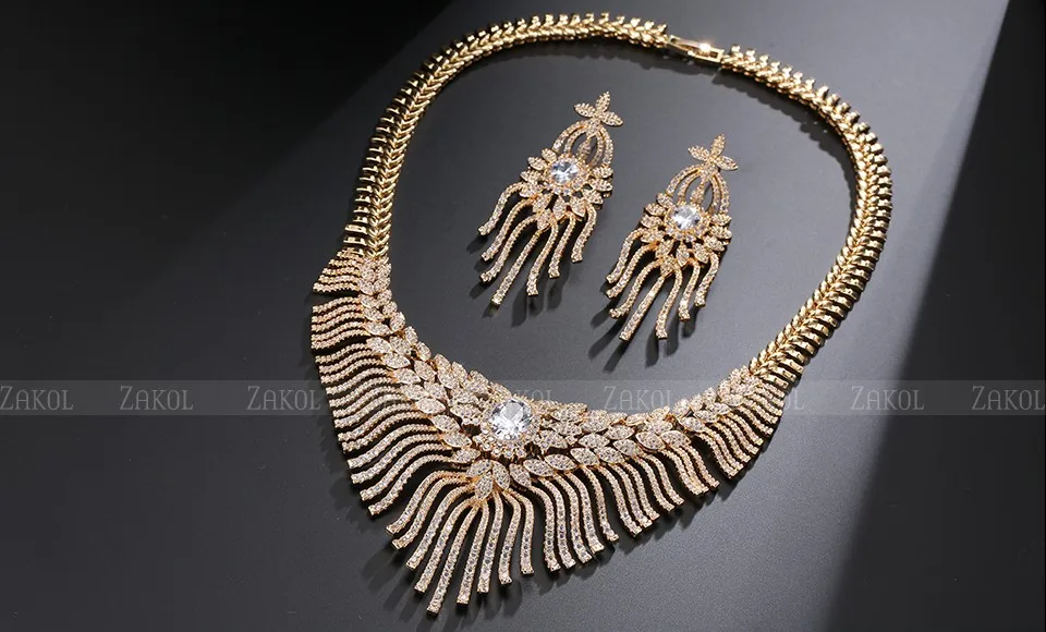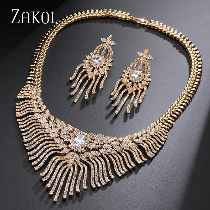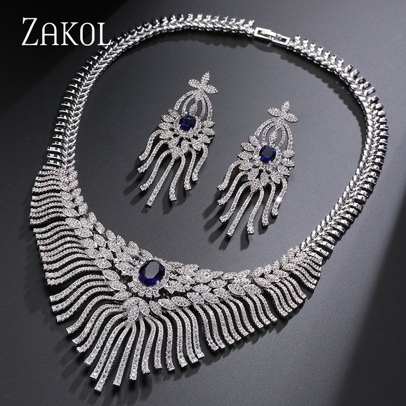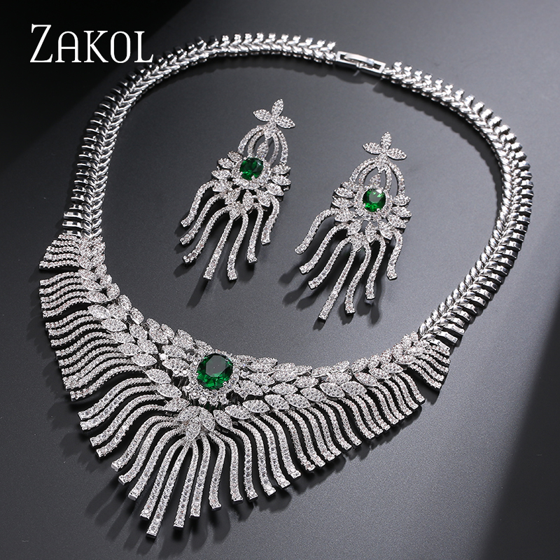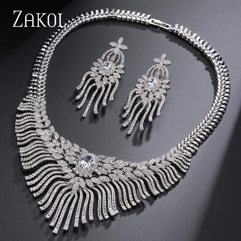 ZAKOL Luxury Oval Cubic Zircon Tassel Jewelry Set Brilliant Zirconia Micro Inlay Earrings Neckalce Set For Women Wedding FSSP298