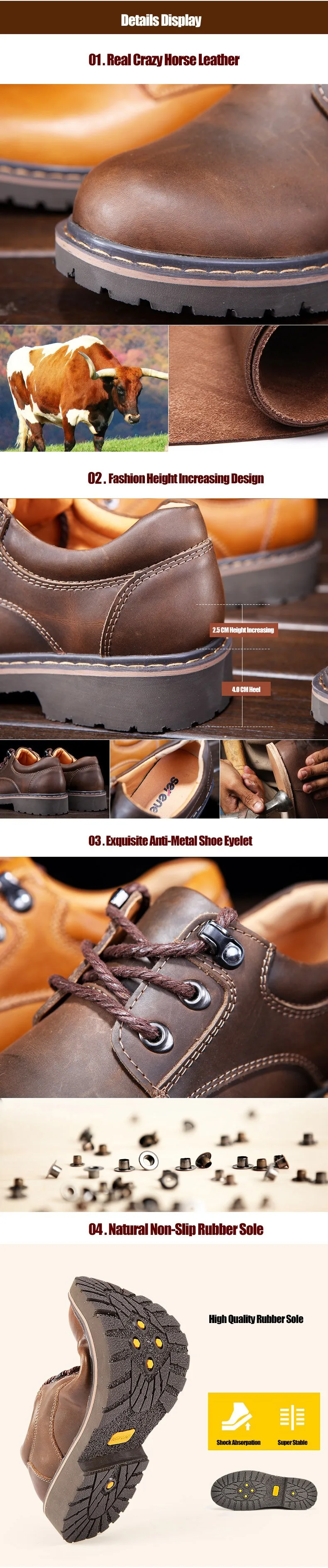SERENE 6277 Autumn Low Top Height Increasing Men's Casual Leather Shoes Fashion Crazy Horse Leather Man Tooling Shoes Size 45 46