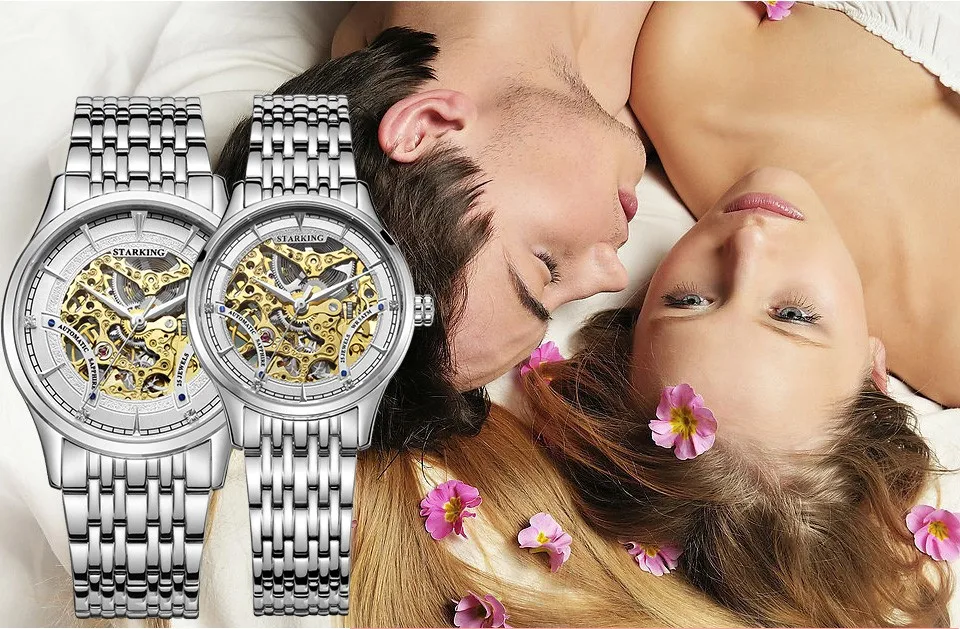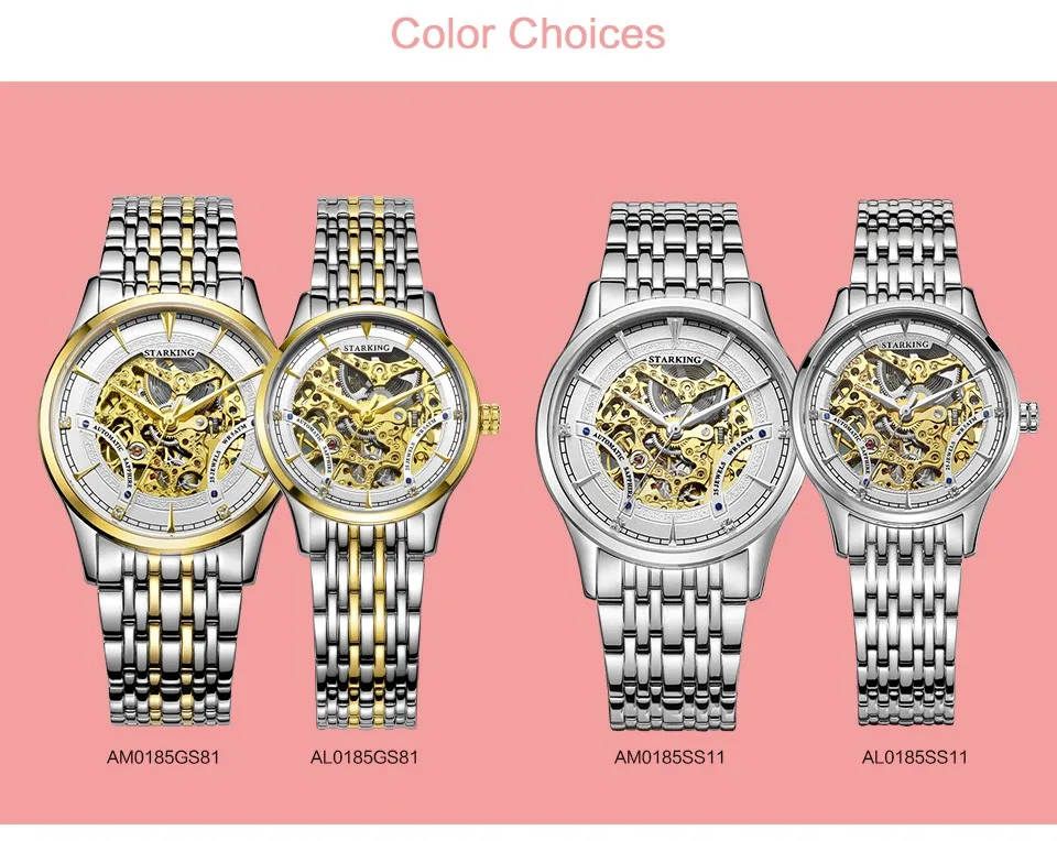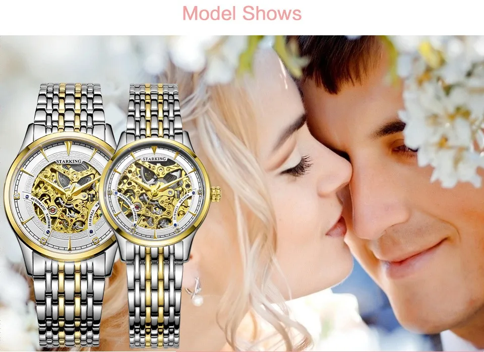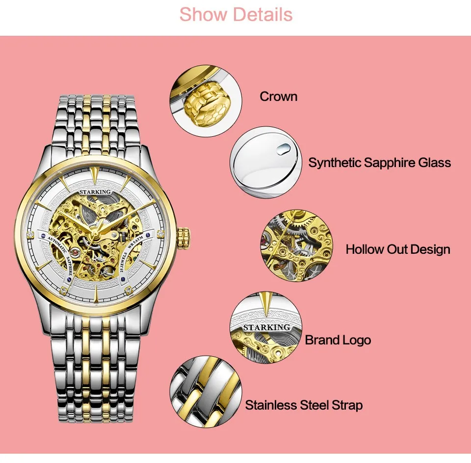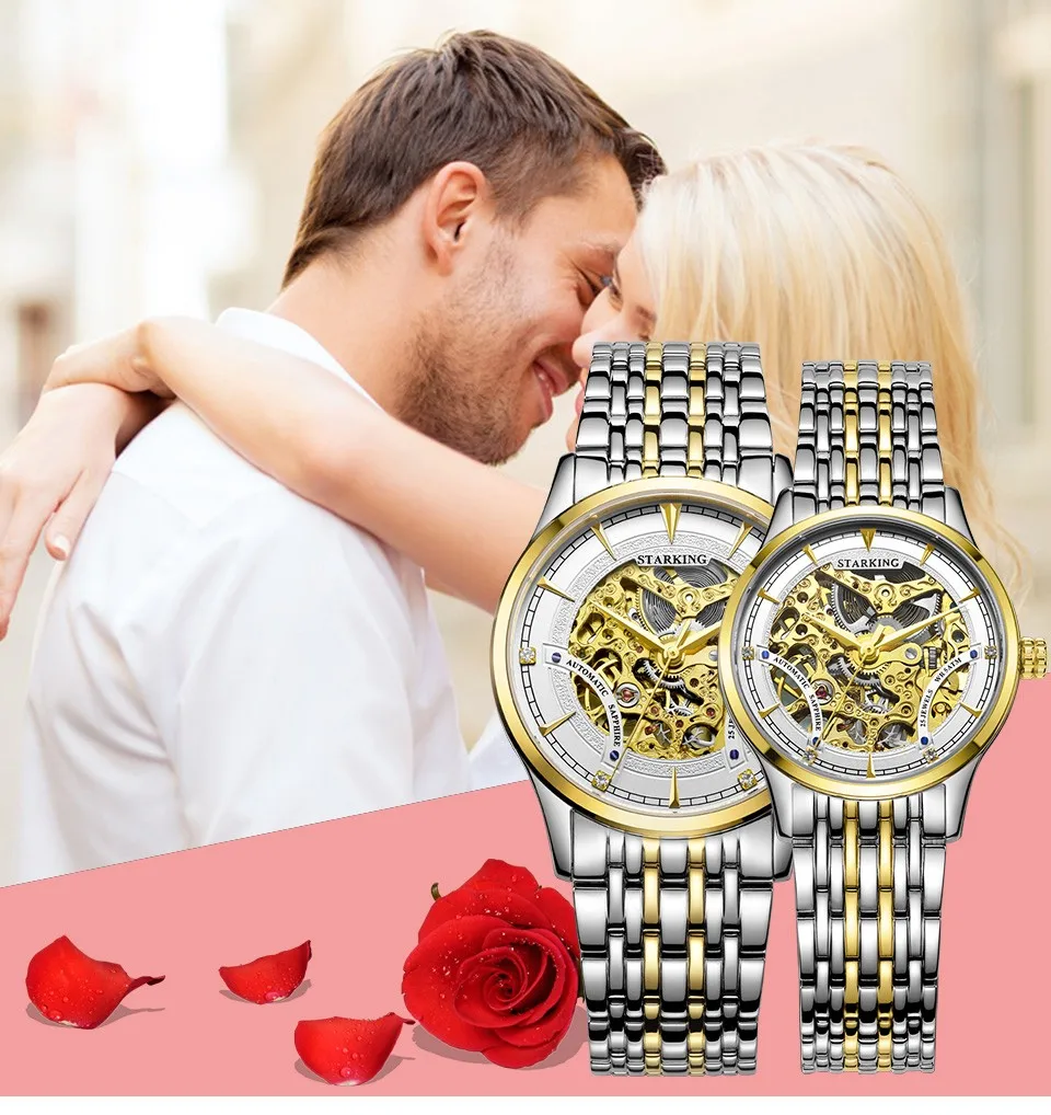 StarKing Luxury Golden Skeleton Automatic Watches Unisex Women And Men Couple Clock Stainless Steel Lover's Wrist Watch AM/L0185