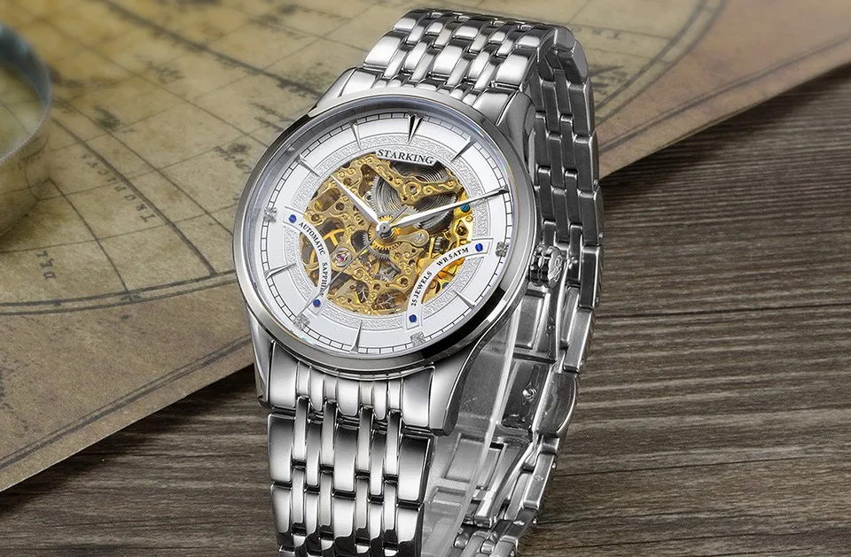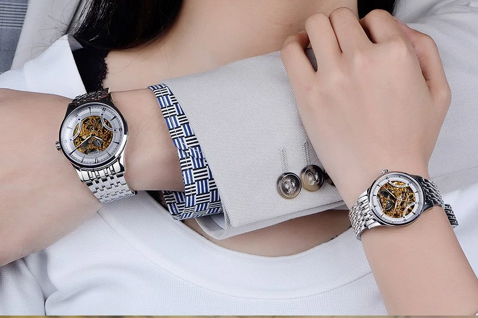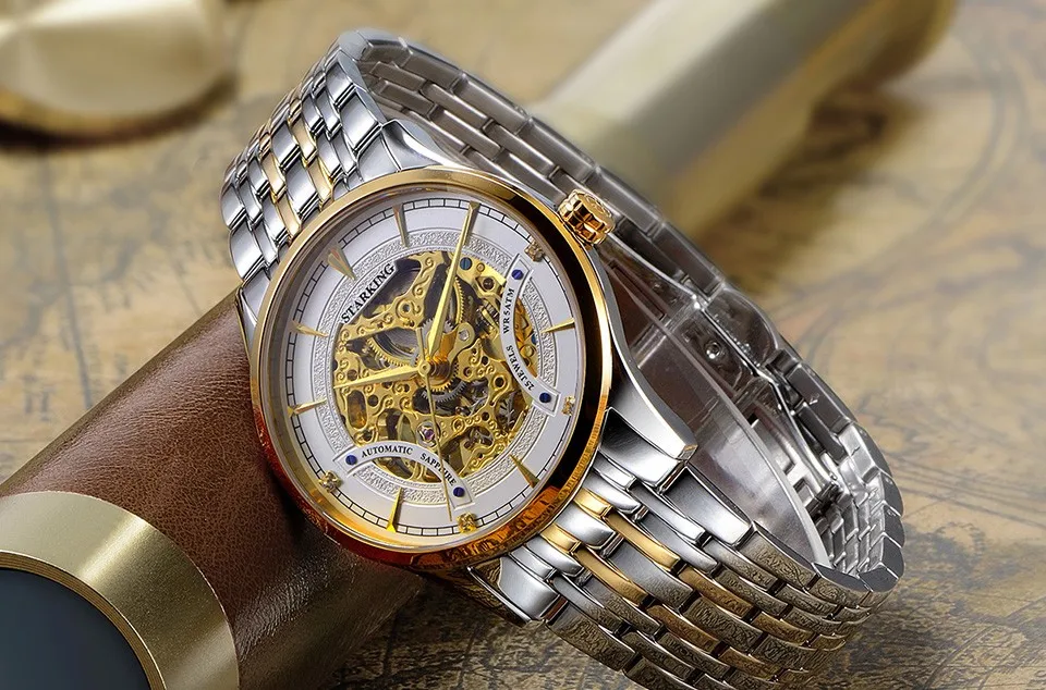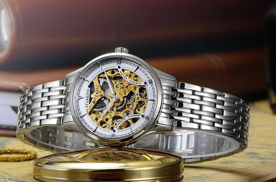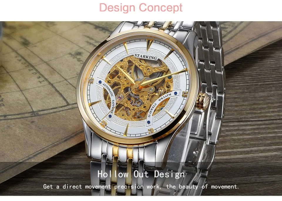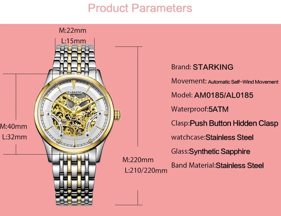 StarKing Luxury Golden Skeleton Automatic Watches Unisex Women And Men Couple Clock Stainless Steel Lover's Wrist Watch AM/L0185