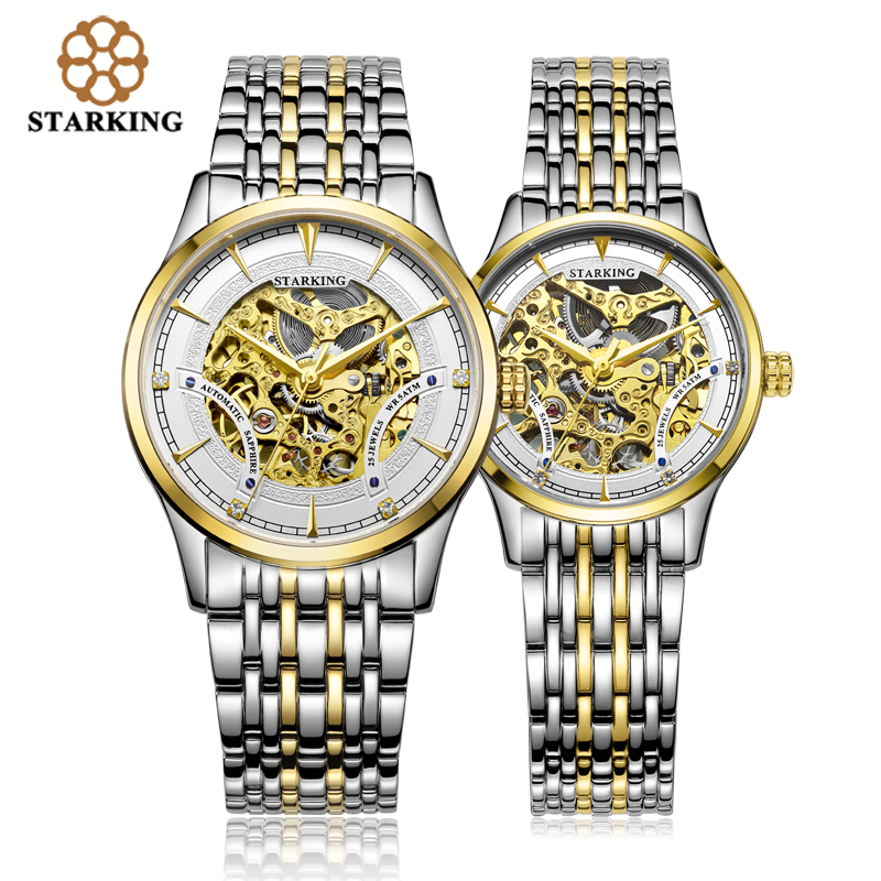 StarKing Luxury Golden Skeleton Automatic Watches Unisex Women And Men Couple Clock Stainless Steel Lover's Wrist Watch AM/L0185